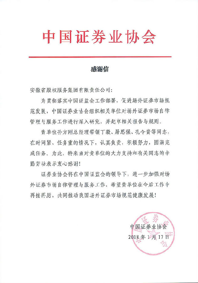 中證協(xié)致安徽股權(quán)服務集團感謝函