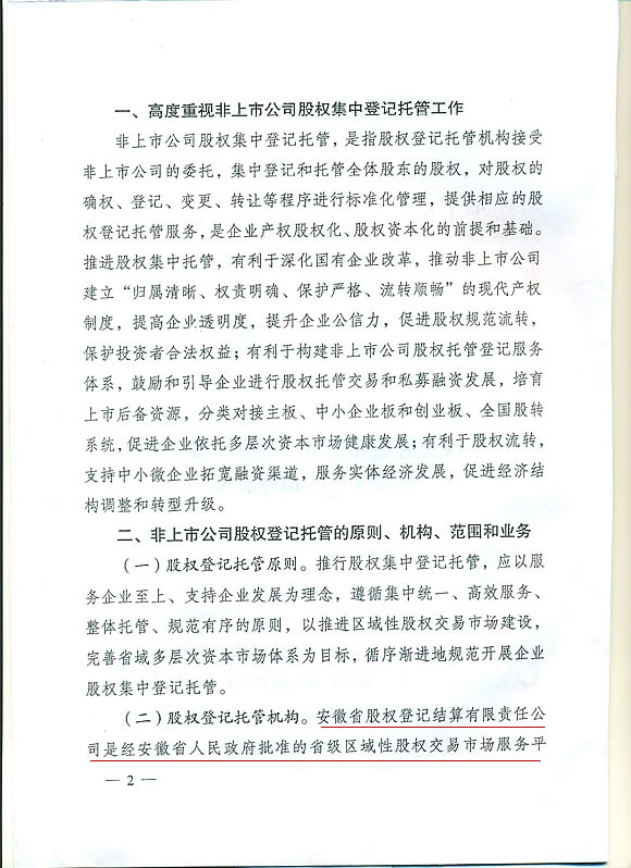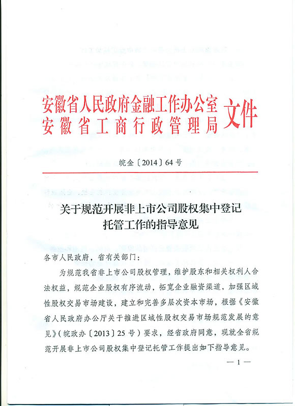 關(guān)于規(guī)范開展非上市公司股權(quán)集中登記托管的指導(dǎo)意見(皖金[2014]64號(hào)])